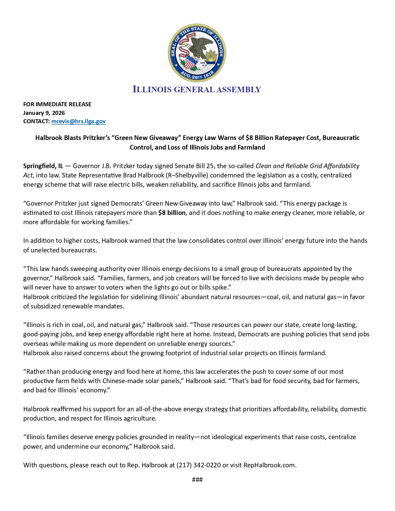 Springfield, IL — Governor J.B. Pritzker today signed Senate Bill 25, the so-called Clean and Reliable Grid Affordability Act, into law. State Representative Brad Halbrook (R–Shelbyville) condemned the legislation as…